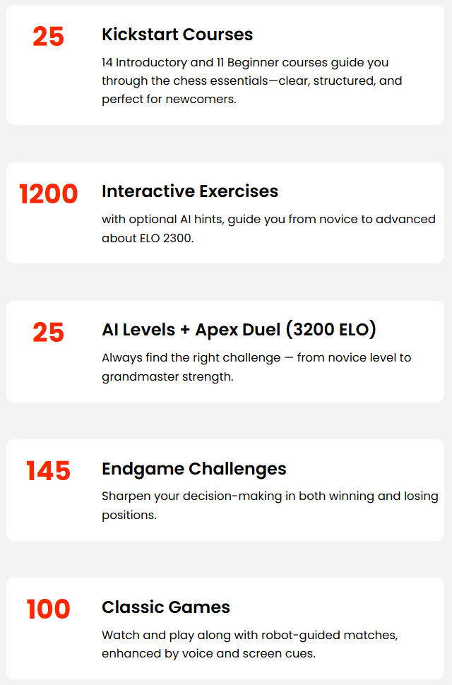 - 1200+ Training Exercises: Tactics, openings, endgames, and more
